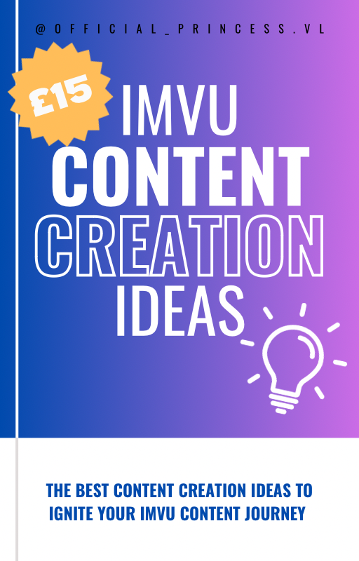 This guide has all the content creation ideas you’ll need to start to be a IMVU content creator. If you’re struggling with content creation ideas for IMVU, no worries! I have created this E-book with over 20 content ideas for you to find your niche and start creating as soon as today!